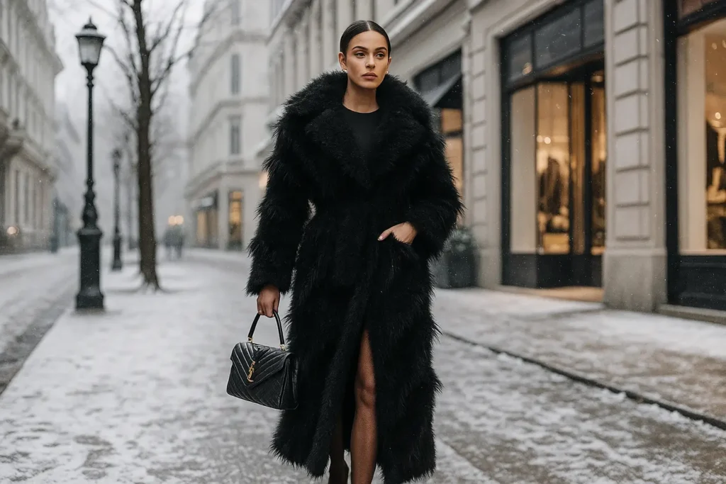 Minimalizm – długie futro czarne + total look w czerni + torebka strukturalna.