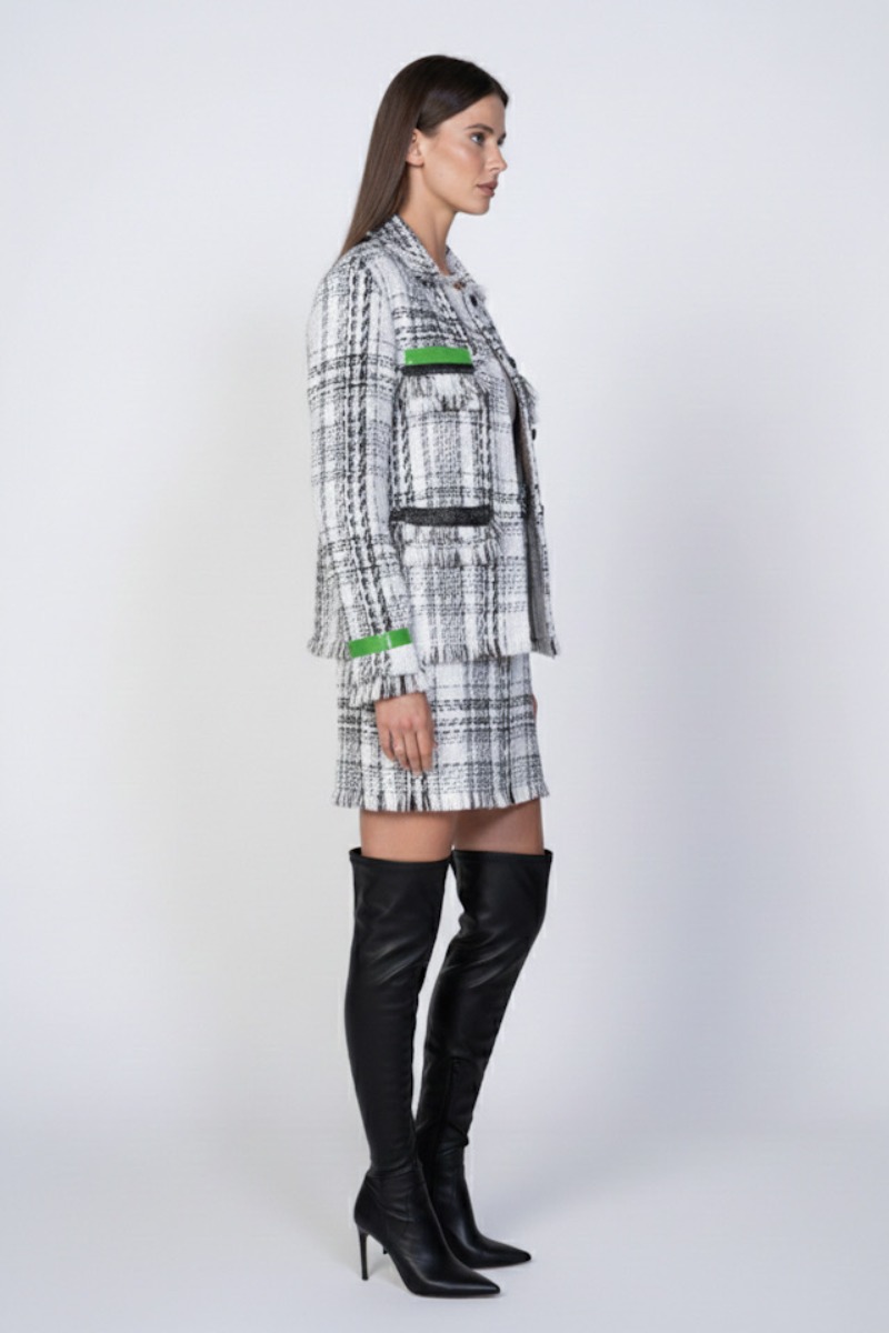 Zestaw składa się z krótkiej, dopasowanej kurtki oraz spódnicy, tworząc spójną i niezwykle stylową całość. Wykonany z wysokiej jakości syntetycznego tweedu, komplet zachwyca trwałością, strukturą materiału oraz doskonałym dopasowaniem do sylwetki.