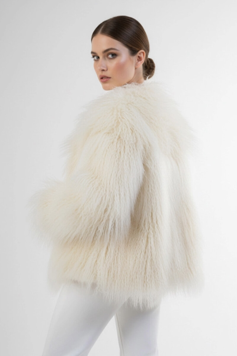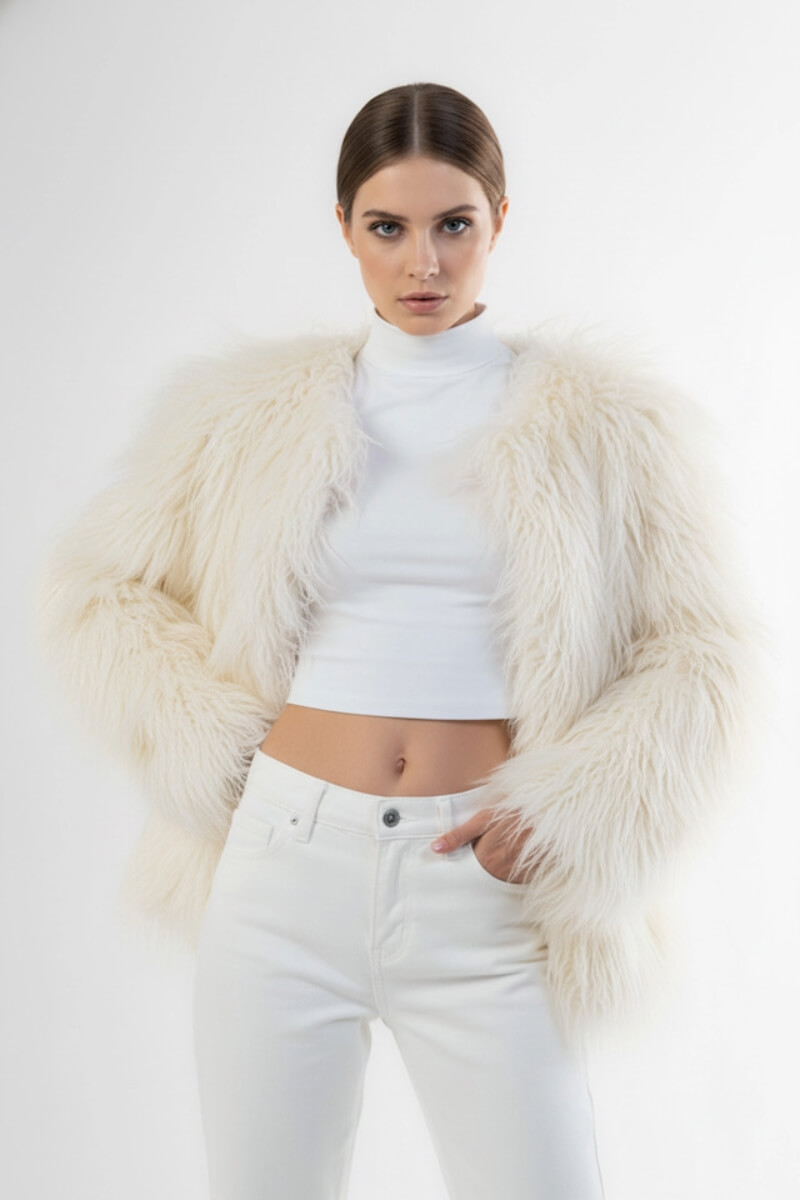 Kremowe sztuczne futerko LIKE A DIVA to synonim subtelnego luksusu w etycznym wydaniu. Krótki fason z długim, miękkim włosiem pięknie otula sylwetkę, nadając jej lekkości i wyjątkowego charakteru. Delikatny, kremowy odcień podkreśla ponadczasową elegancję i sprawia, że futerko doskonale uzupełnia zarówno codzienne, jak i wieczorowe stylizacje.